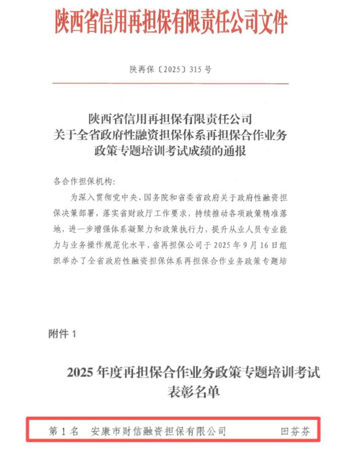 近日,陜西省信用再擔保有限責任公司舉辦全省政府性融資擔保體系再擔保業(yè)務政策專題培訓,安康財信擔保風控評審部副經(jīng)理田芬芬同志喜獲政策培訓考試全省第一名優(yōu)異成績,在全省政府性融資擔保體系范圍內(nèi)獲書面通報表揚。